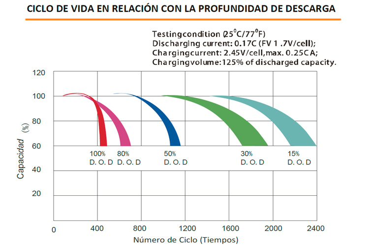 Según estos datos, mi recomendación es que, con el fin de aumentar la vida útil en baterías de AGM o GEL, sería recomendable no hacer descargas de más del 50% de la capacidad de la batería. Esto no quiere decir que un día que lo necesitemos, podamos descargar un poco más la batería, pero no hacerlo de forma habitual.