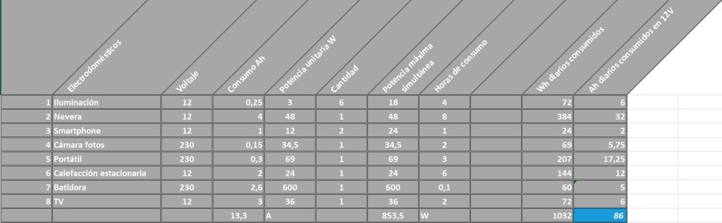 - Paso 3: Una vez que tengamos todos los Ah diarios consumidos en 12V, sumamos todos los valores para conocer el consumo total diario de nuestra instalación. En nuestra simulación nos salen 86Ah diarios consumidos.