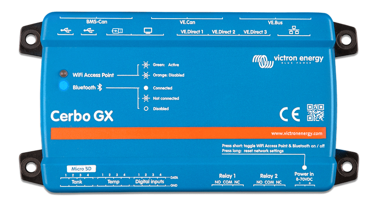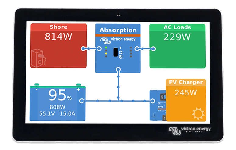 Es una centralita o sistema de recogida de datos de todos los componentes de la instalación, regulador de carga, smartshunt, inversor/cargador, boyas de depósitos, sensores de temperatura… Relaciona toda la información que estos equipos le facilitan, y nos da a través de una pantalla táctil muy atractiva en la cual podemos navegar, los resultados de esta información, estado de carga de las baterías, energía solar que aportamos al sistema, carga desde alternador, consumos… Encender o apagar diferentes dispositivos como una bomba de agua, inversor/cargador, consumos en CC… Conectividad total, a través de Bluetooth con la App Victron Connect, y Ethernet o Wifi a través del Portal VRM de Victron Energy, esto es muy interesante si estás de viaje y tienes alguna incidencia en el sistema, para que un técnico se pueda conectar a distancia y diagnosticar el posible problema. También se le pueden añadir módulos adicionales como un GPS USB, para que teniendo el equipo conectado a internet puedas ver en todo momento donde está ubicada la instalación.